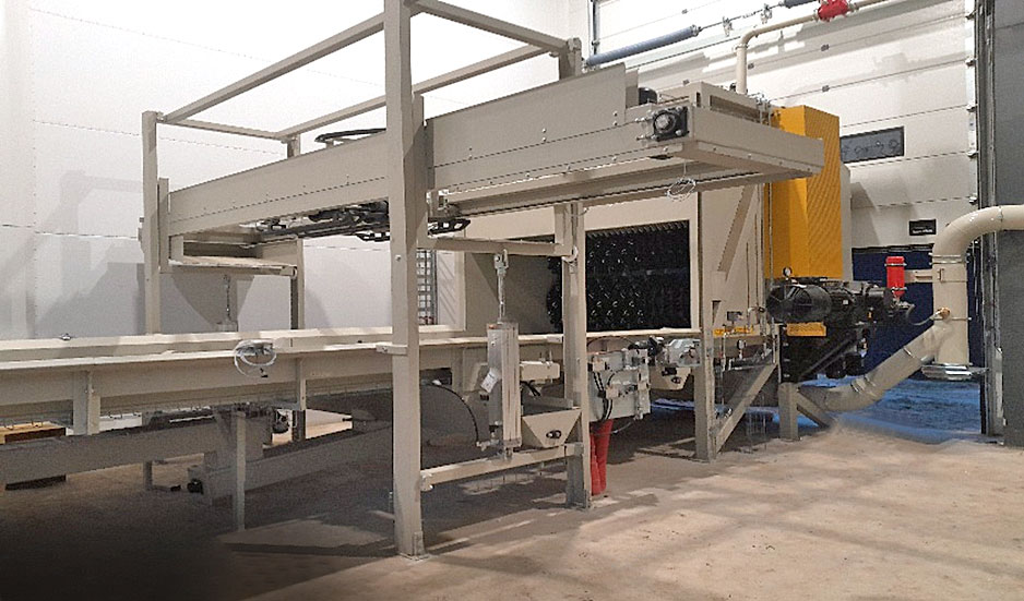 Processen starter med en automatiseret halmkran, der transporterer ballerne direkte til systemet uden manuel indgriben.