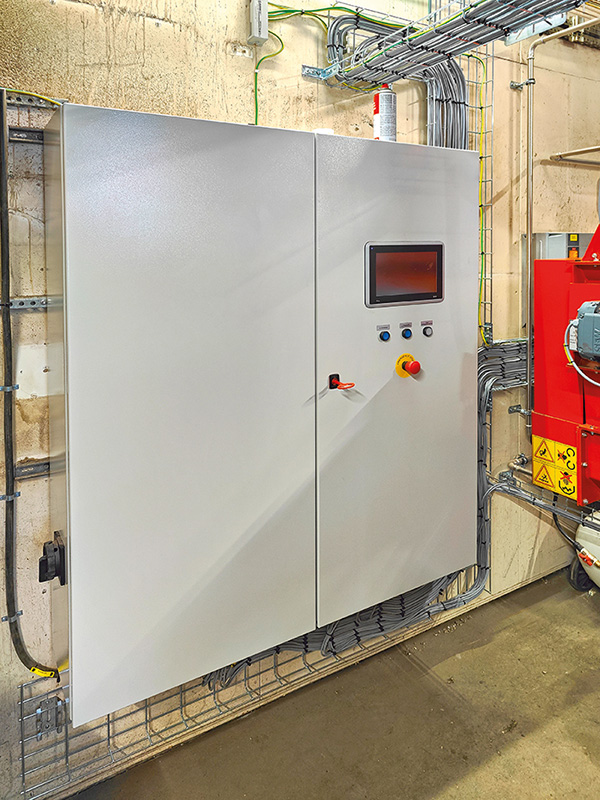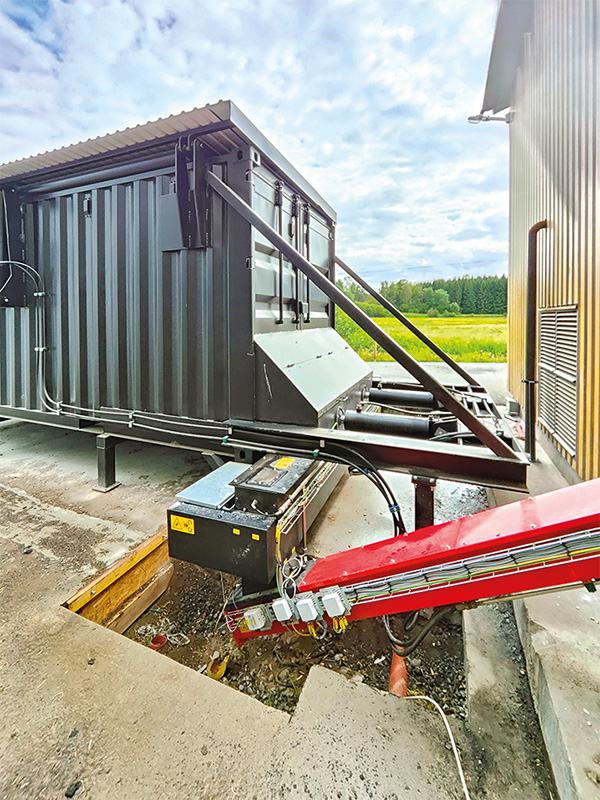 En 3 m3 askecontainer er placeret uden for bygningen, hvortil asken automatisk transporteres. Den installerede PLC styring sikrer en konstant overvågning af anlæggets ydeevne.